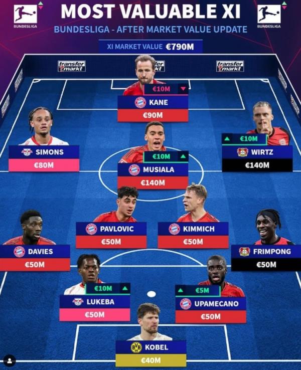 12月20日訊 《轉(zhuǎn)會(huì)市場(chǎng)》今日更新了德甲球員身價(jià),并列出了一套德甲最貴陣,拜仁6將在列,萊比錫、藥廠(chǎng)各2人。